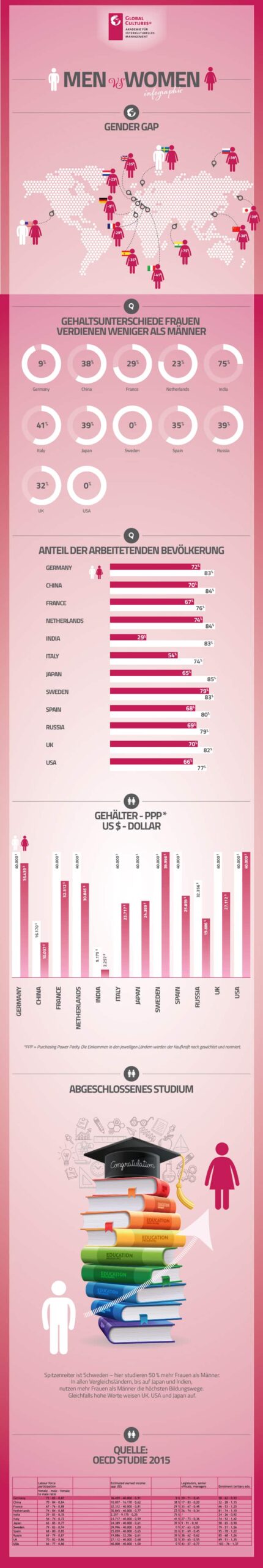 Eine OECD-Studie aus 2015 belegt, dass Frauen in Deutschland schlechter bezahlt werden als Männer. Dennoch schneidet Deutschland im internationalen Vergleich gar nicht einmal schlecht ab. Hier wurde nach Purchasing Power Parity (Kaufkraftvergleich) berechnet, um die Unterschiede zwischen 12 ausgewählten Ländern vergleichbar zu machen.
